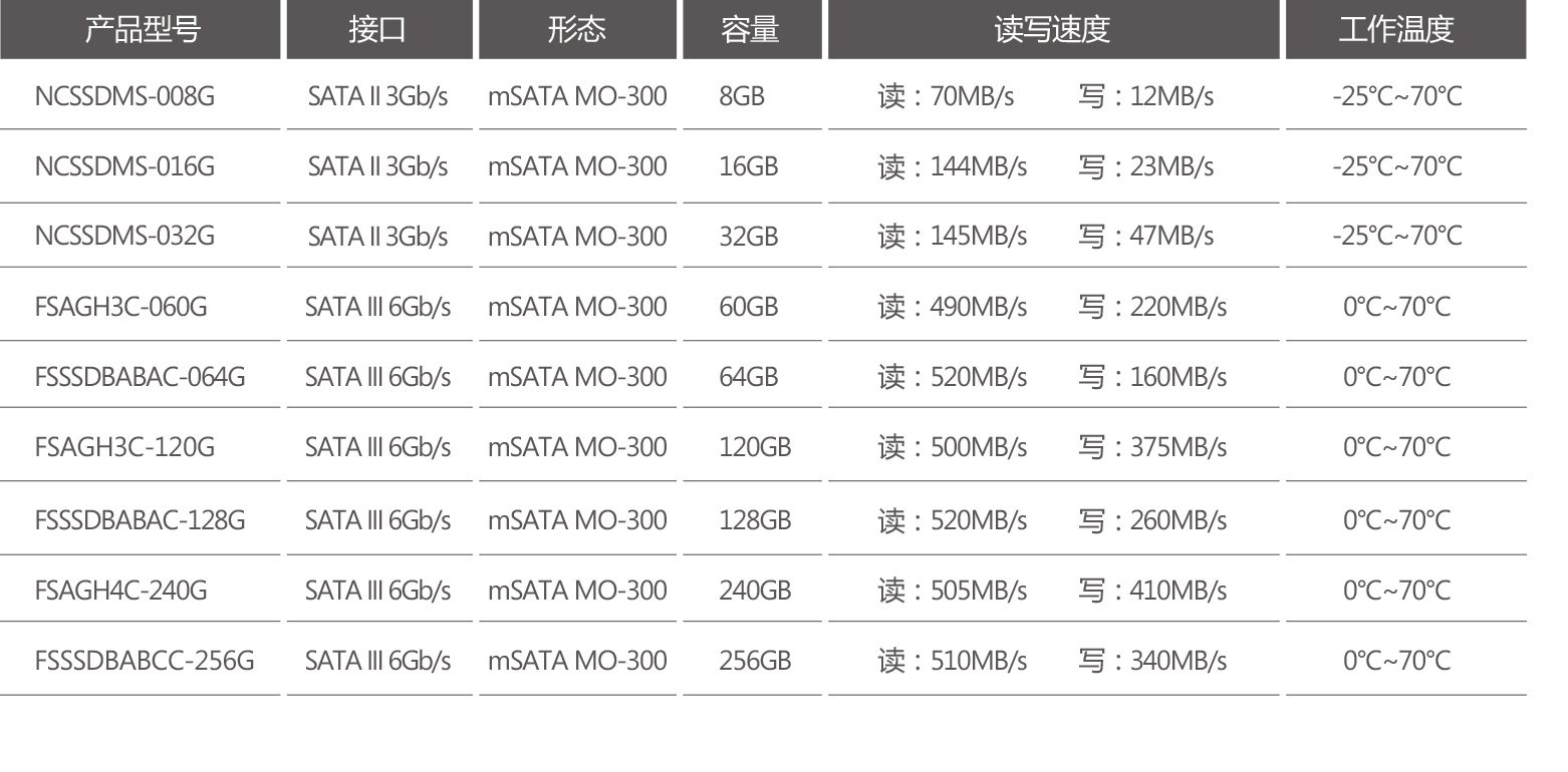 mSATA SSD 江波龍F(tuán)ORESEE mSATA SSD可支持8GB到256GB容量,產(chǎn)品分為消費(fèi)級(jí)和工業(yè)級(jí)。其中消費(fèi)級(jí)mSATA SSD廣泛應(yīng)用于筆記本電腦和臺(tái)式電腦;工業(yè)級(jí)mSATA SSD則應(yīng)用于各種工業(yè)設(shè)備,如車載多媒體終端、瘦客戶機(jī)等。 產(chǎn)品參數(shù) 產(chǎn)品圖片 產(chǎn)品應(yīng)用